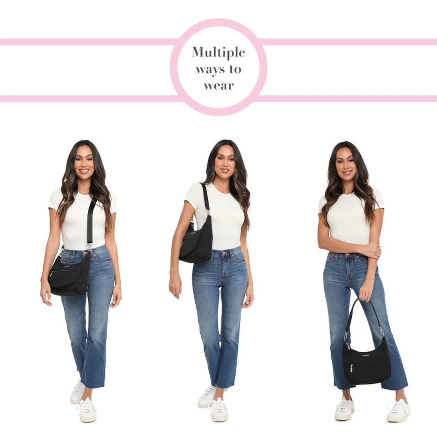 Complete with a scratch-resistant pocket, pen and lipstick loops, and a convenient privacy pocket, this sleek everyday bag offers a variety of ways to stay organized on the go. With a detachable crossbody strap and comfortable shoulder strap, our stylish Half Moon bag offers wear-it-your-way versatility for those extra-busy days.