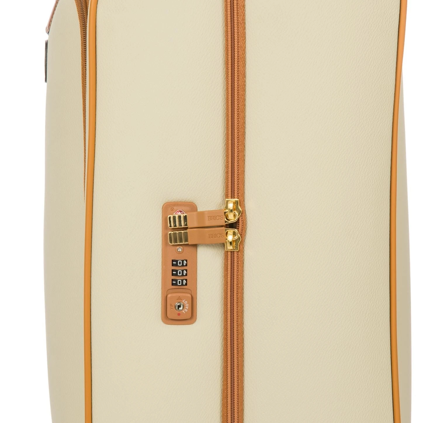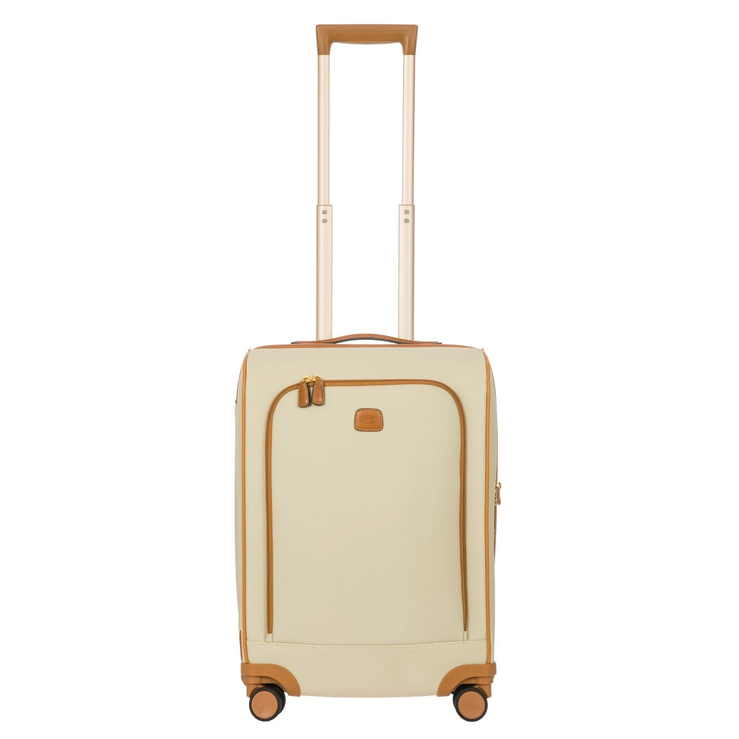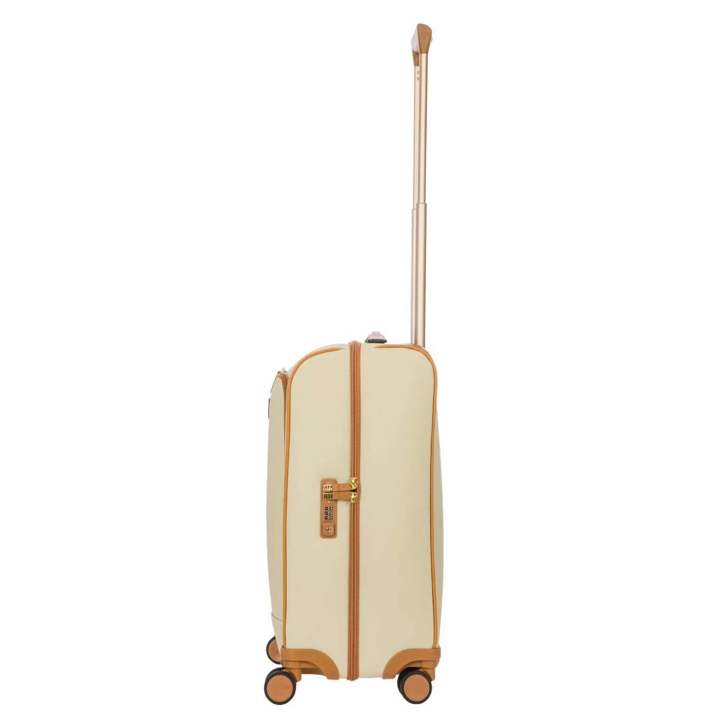 21 inch ultra-lightweight carry-on trolley from Bric’s FIRENZE collection. A unique style with a retro twist available in the elegant cream color. Made from embossed synthetic material that is both durable and easy to clean. The vegetable tanned Tuscan leather finishes take on an aged look over time, making this carry-on trolley unique and personal. Its dimensions mean that it can be taken on board the plane with you as hand luggage.