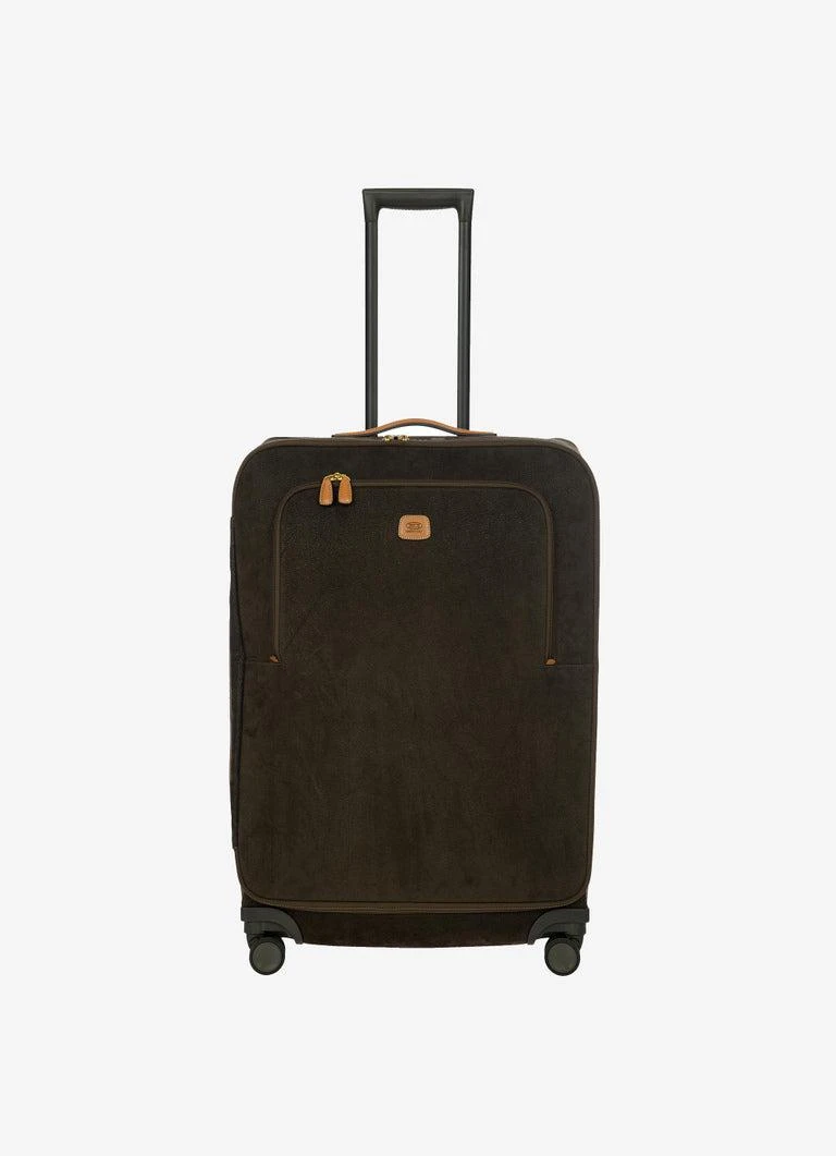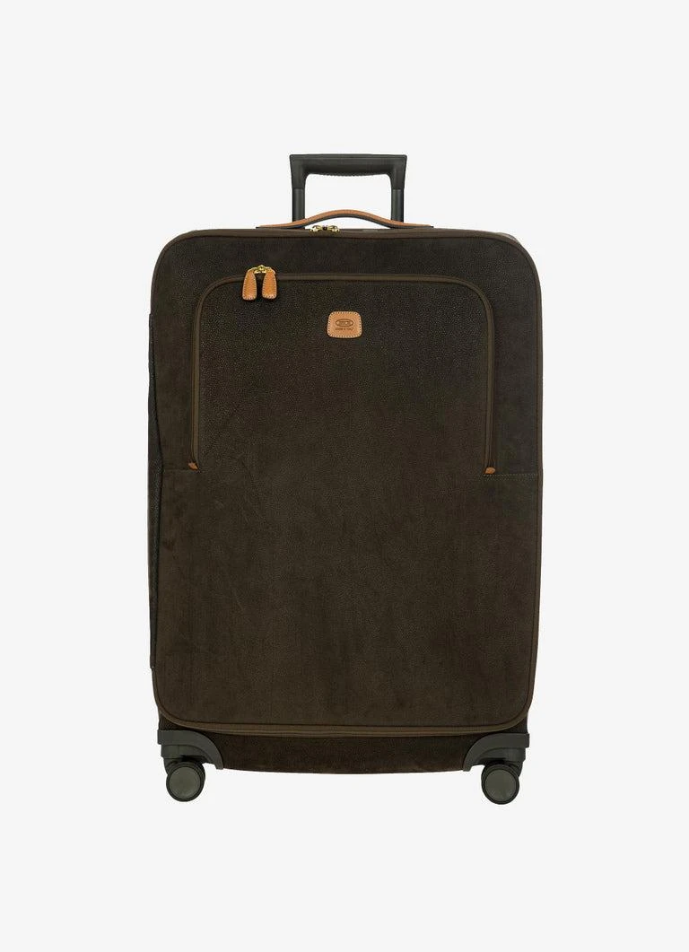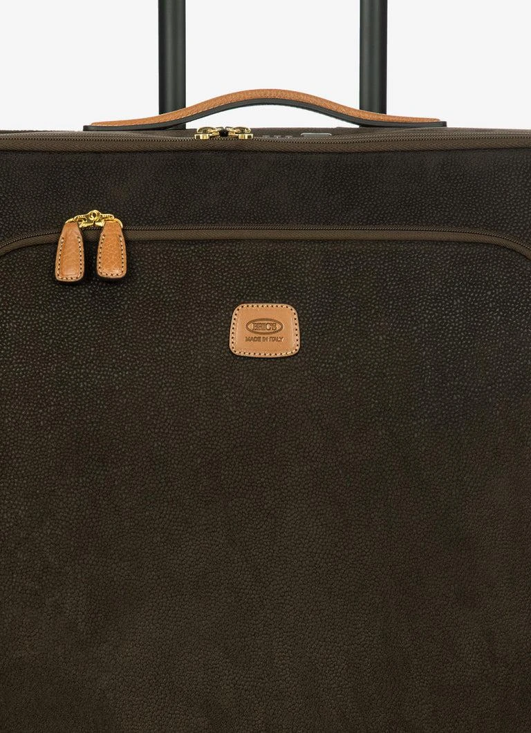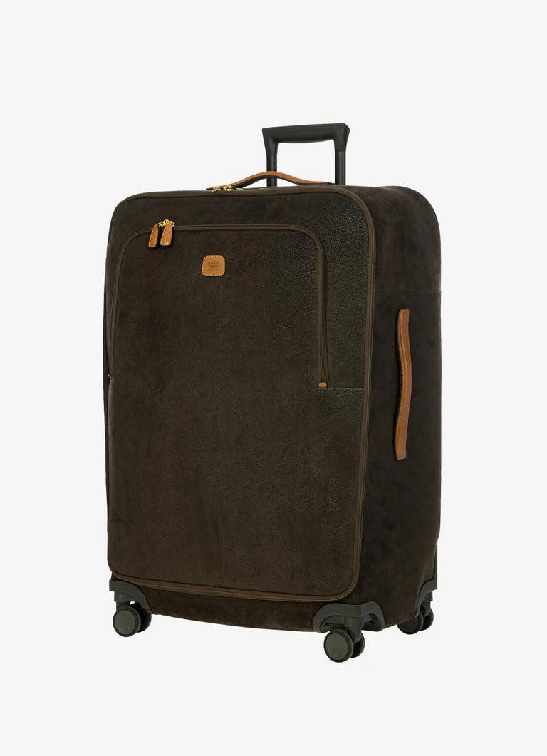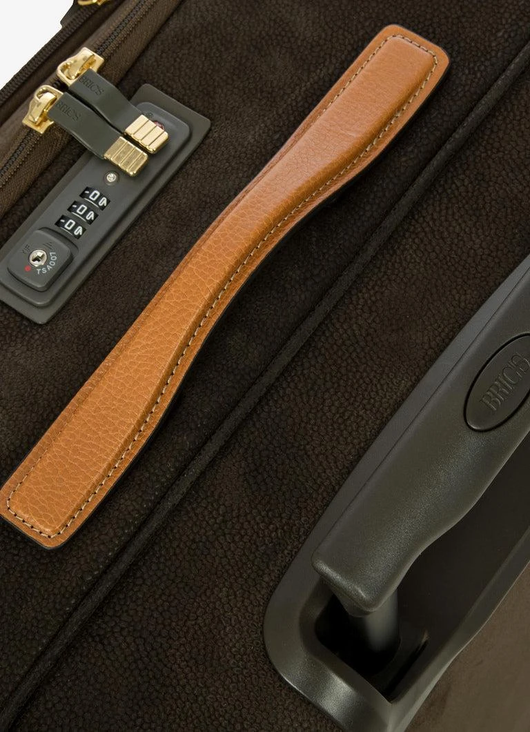 Designed and made in Italy, this medium trolley from the Life Collection is built to last. It’s in Bric’s iconic suede-look material, the waterproof, extra durable result of fine-tuned artisanal production processes. Everyday use will give it a vintage look, making it even more unique. The structure of this trolley ensures stellar performance: the outer fabric has been applied to a self-supporting, crush-resistant structure that’s hard at the sides. This ensures it will stand up to impact and, because it ‘remembers’ its original shape, it won’t warp – no matter what. The inside is lined in fabric that’s on-tone with the outer material. The front zip pocket holds items that are essential to always have to hand. The main compartment of the trolley is opened by a double-slide zip. Integrated TSA lock. The four swivel wheels move quietly and rotate a full 360° for guaranteed maneuverability, equipped with ball bearings that create a smooth ride. The wheels are recessed to maximize the capacity of the suitcase. To ensure comfort and ease of use, the retractable handle is made up of robust, sturdy aluminum tubes with intermediate stop positions and an ergonomic grip. Integrated address tag carrier. The exterior is trimmed by carry handles and details in real leather, a distinguishing Bric’s detail.
