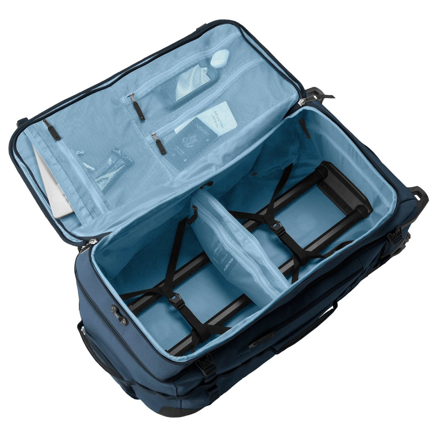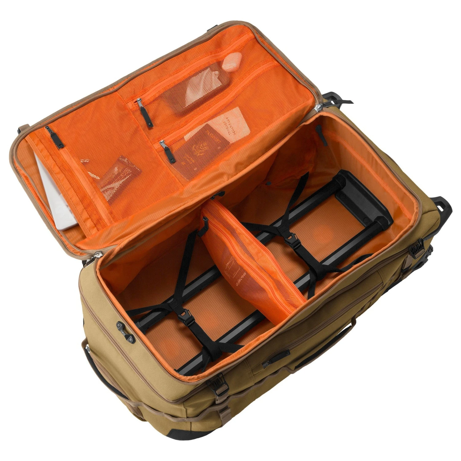 - Removable interior divider shelf with zippered pockets separates items