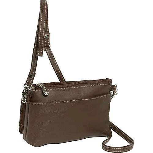 The Shoulder Bag/Wristlet has a front compartment that zips around to reveal multiple card organizer, window ID pocket, currency slide pocket, and two open pockets. Top-zip opening to main compartment with interior zip-pocket. Rear open pocket with magnetic snap closure. Adjustable/detachable shoulder strap and detachable wrist strap.