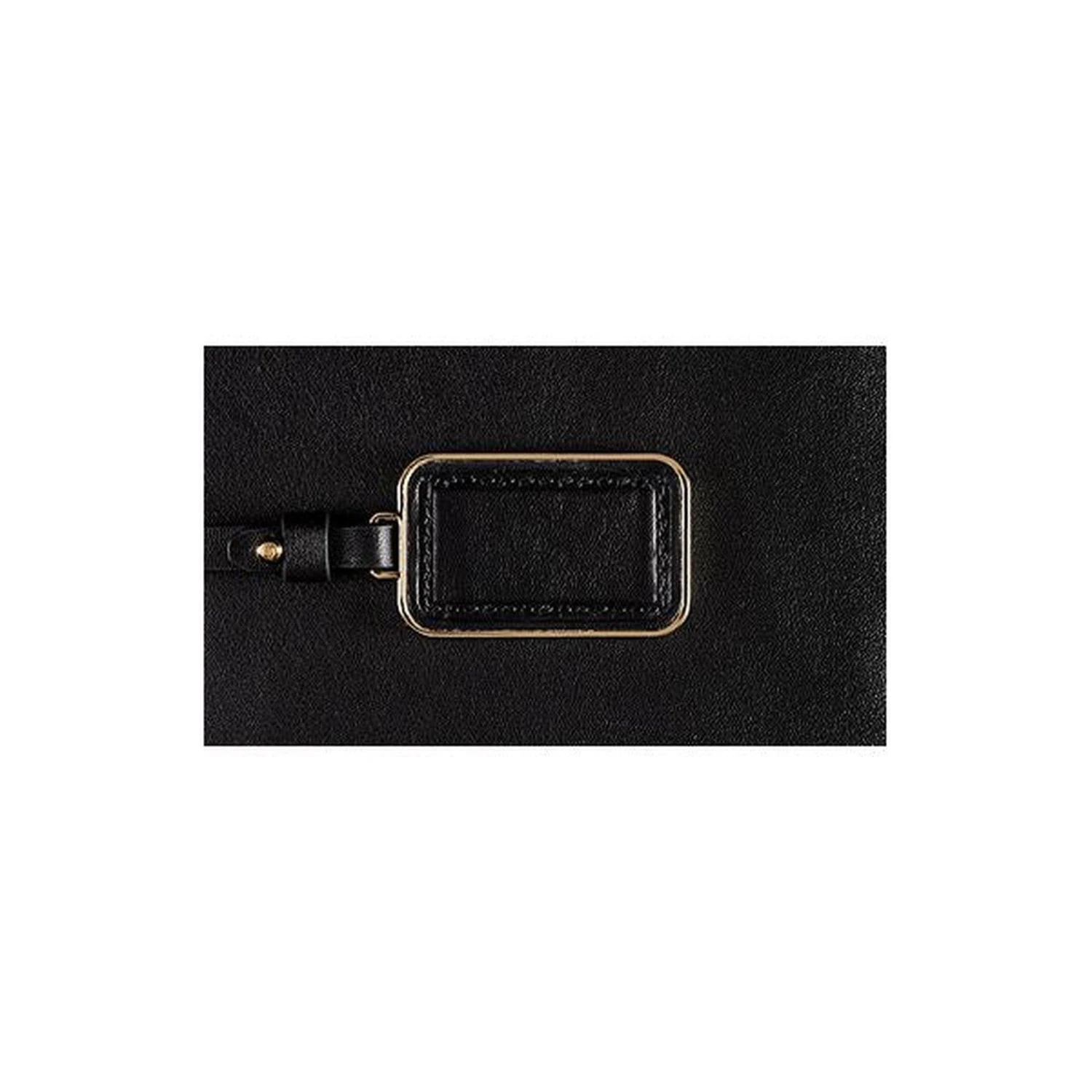 - Padded laptop compartment with leather snap tab (fits 15″ screens)